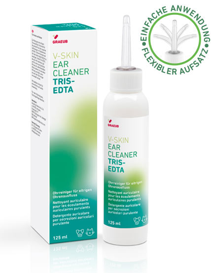 Lassen Sie das Tier den Kopf schütteln, um das Gemisch aus Sekret und Produkt aus dem Gehörgang zu entfernen. Umwickeln Sie einen Finger mit sauberer Gaze und reinigen Sie die Öffnung des Gehörgangs und die Ohrmuschel, wobei Sie darauf achten, dass Sie den Finger nicht zu tief einführen, um das Tier nicht zu verletzen. Verwenden Sie keine Wattestäbchen. Reinigen Sie die Kanüle nach jedem Gebrauch.